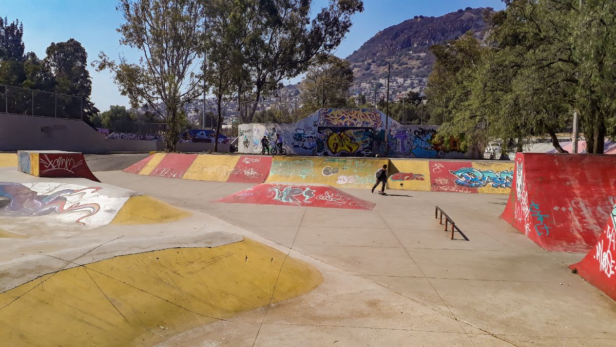 Outdoor concrete public skatepark with Bowl, street and mini ramp. |